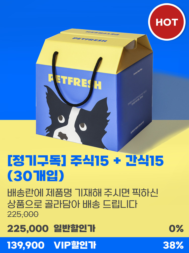 희망하는 주식 15개 + 간식15개를 배송란에 기입해주시면 요청하신 제품으로 배송됩니다.