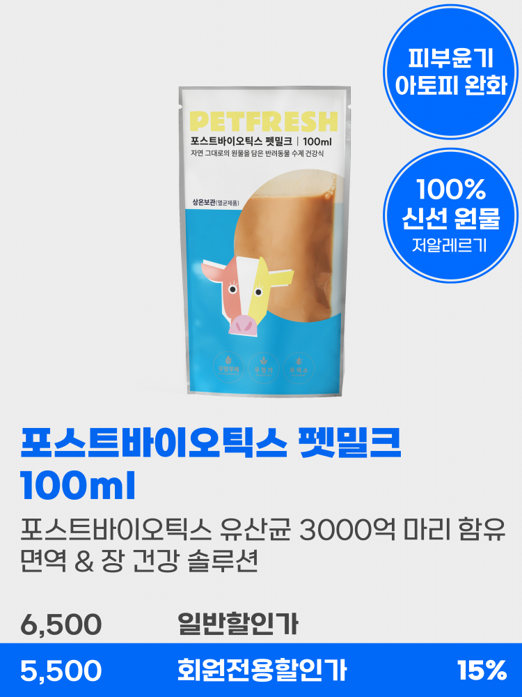 진-한 원유에 포스트바이오틱스가 가~득 담긴 펫밀크,를 만나보세요.