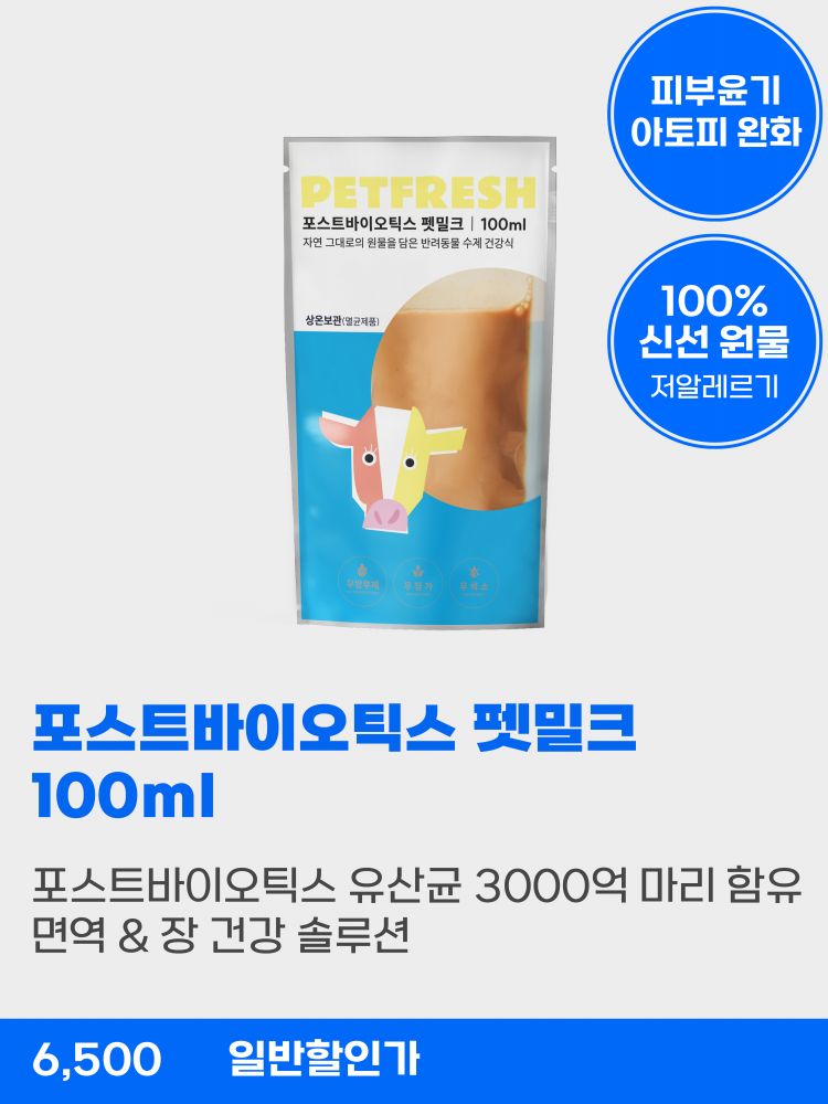 진-한 원유에 포스트바이오틱스가 가~득 담긴 펫밀크,를 만나보세요.
